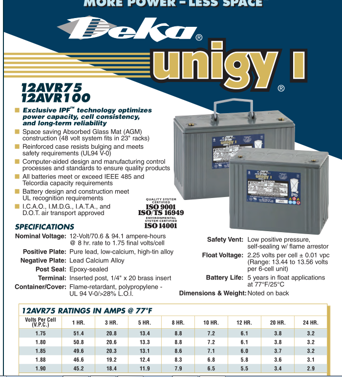 DEKA Unigy II系列德克蓄电池 DEKA Unigy II系列电池可能是全球最可靠、外形最美观的2伏蓄电池产品,采用多项成熟工艺、专利技术,制造过程多达250道严格的质量控制检测,其长寿命、高可靠性、单体大容量已为众多关键数据保护用户之首选,在北美诸多关键数据中心和大功率太阳能应用场合被大量可靠使用。